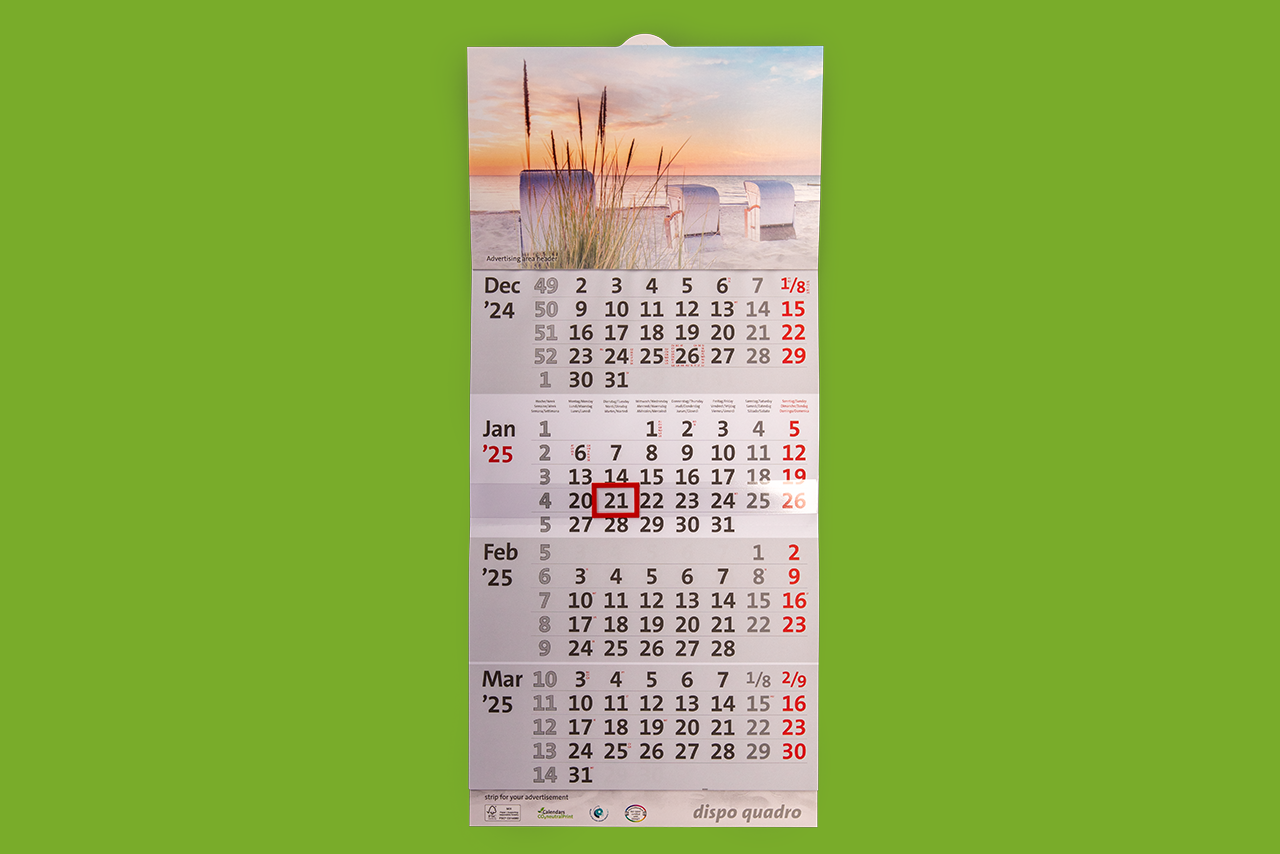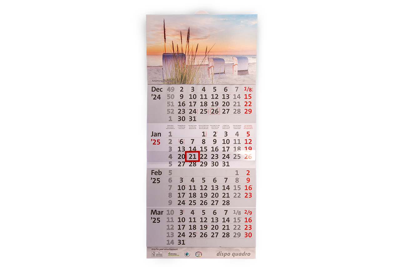 The wall planner dispo Quadro is a compact 4-month calendar. The single block calendar is finished in a high quality and provides you with a lot of space for your advertising with an extra large header, and your customers will have 4 months at a glance for their planning.