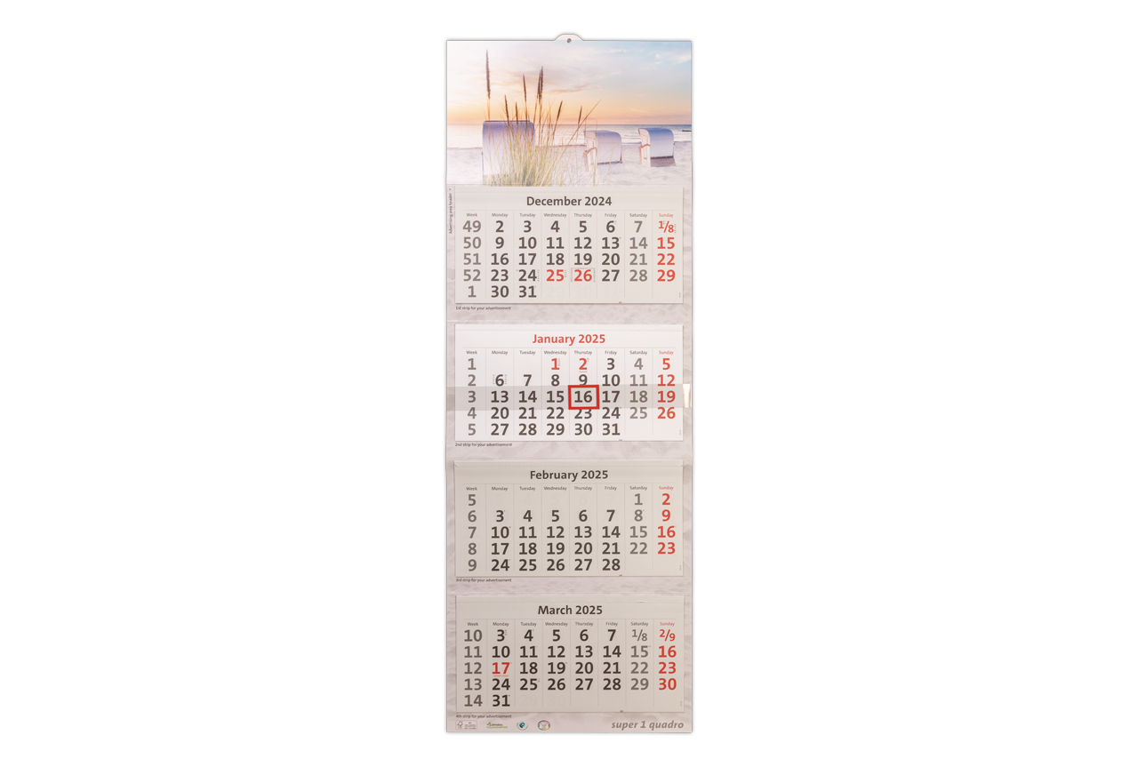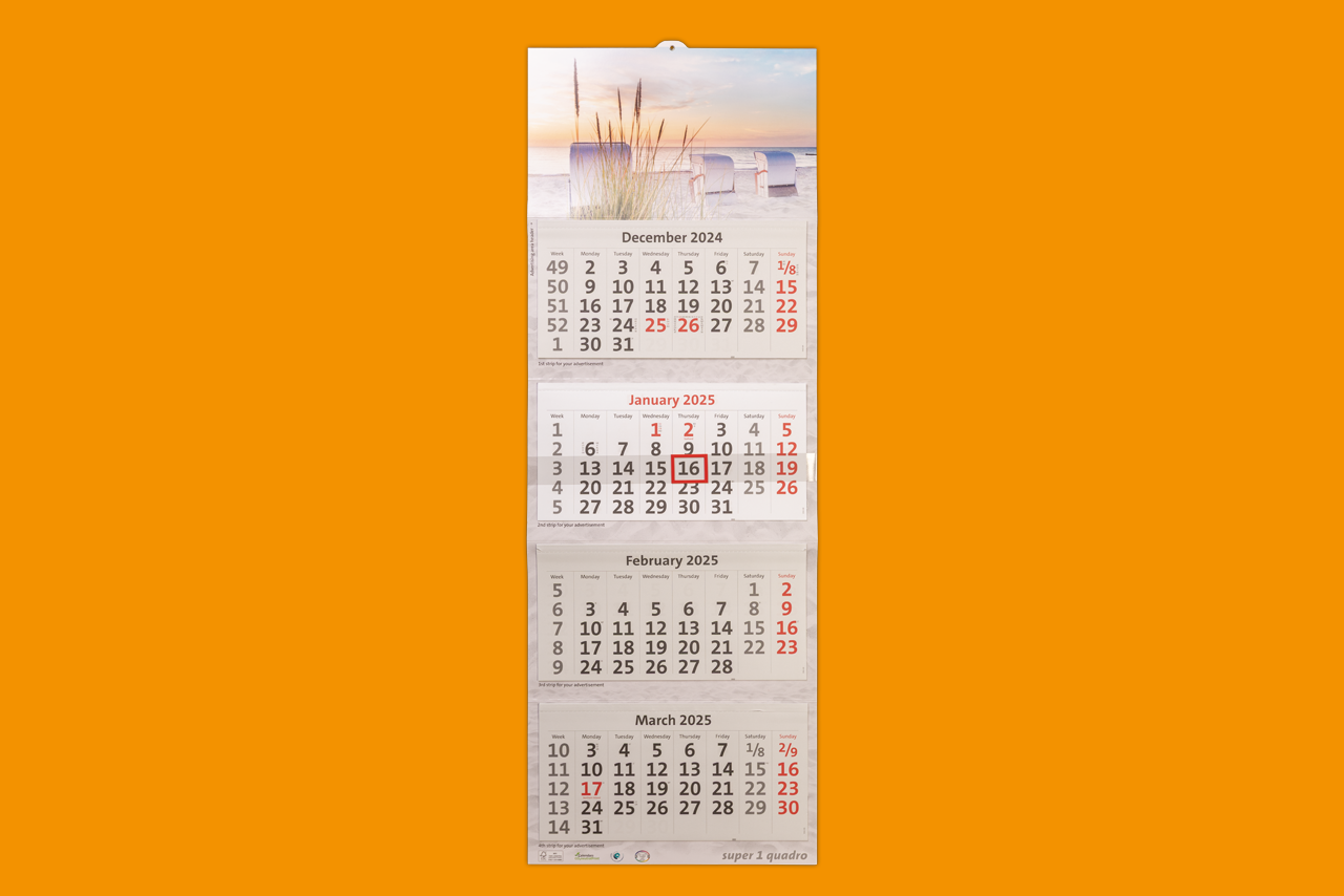 The 4-month calendar Super 1 Quadro provides you with a lot of space for your advertising on the extra large header, backboard and the advertising strips.