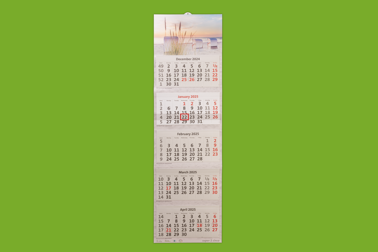 Our 5-month calendar Super 1 Cinco provides you with more space for your advertising with a large header, completely printable backboard with 4 advertising strips between the calendar pads, and one at the bottom all in FSC® quality.