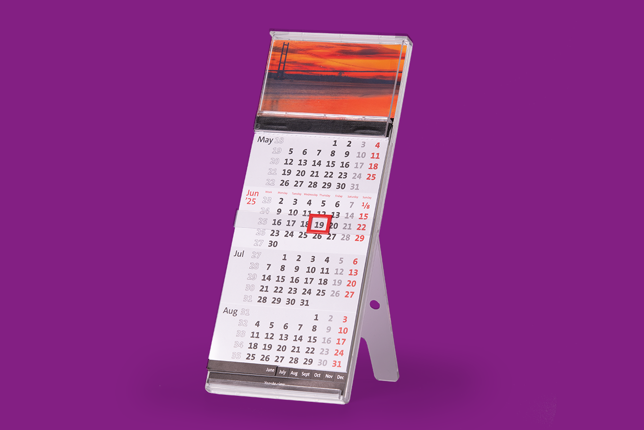 Our table stand Quadro desk calendar comes with a 4 month to view datepad and is competed with a date cursor on a transparent carrier. Your advertisement and calendar pad are held securely in an acrylic stand. These desk calendars come inserted into individual mailing cartons for forwarding on to your clients.